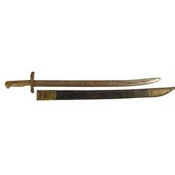 BAYONET FOR MODEL 1855 RIFLE. 21-3/8" single fuller Yataghan blade with no markings. “JH" inspector mark on top of the hilt, “C" is stamped on the right side of the crossguard, “18" on the left. Scabbard has a brass tip and throat. The catch is missing. CONDITION: Blade has many nicks and moderate rust on the blade heavier at the throat, patina is very dark on the brass. Scabbard is very good with light chipping to the finish. 4-49706 FS295