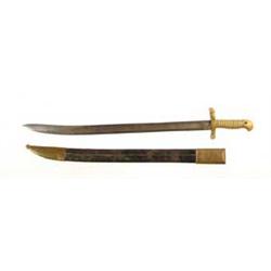 BAYONET FOR MODEL 1855 RIFLE. 21-3/8" single fuller Yataghan blade with no markings. “JH" inspector mark on top of the hilt. Scabbard has a brass tip and throat. CONDITION: Gray patina on blade with scattered spots of moderate pitting. There is some pitting on the right side of the hilt. Scabbard has many chips and scratches. 4-49640 FS296