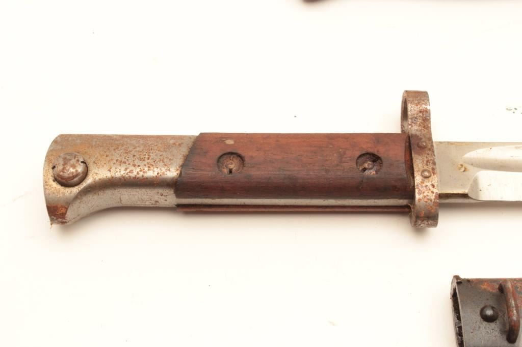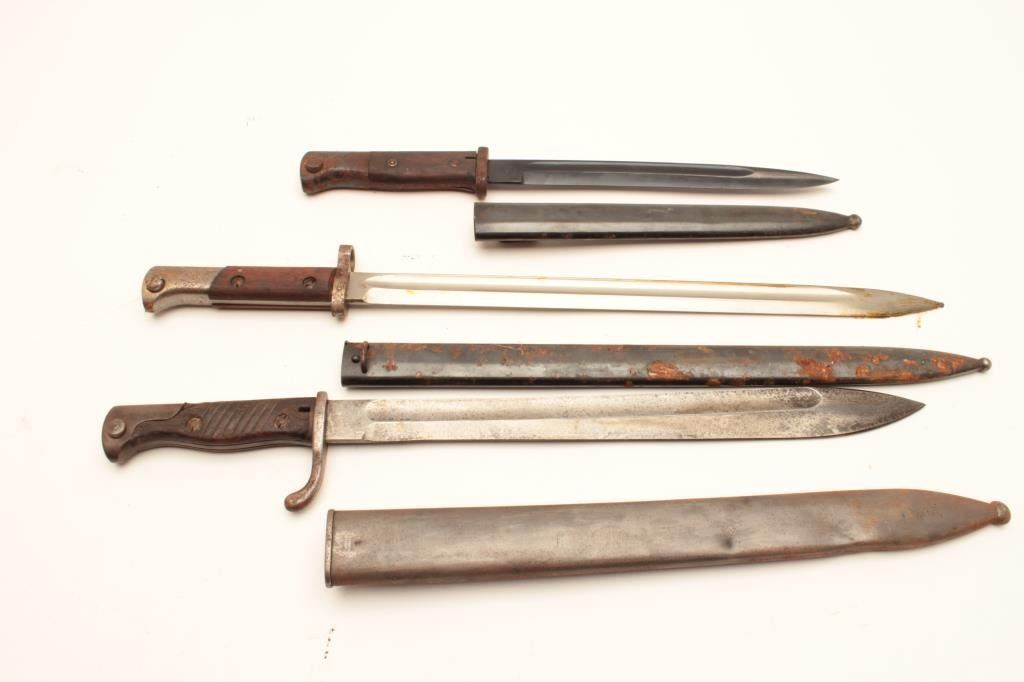 Lot of 3 Mauser bayonets. 1- “Butcher’ knife style WW1 era marked Waffen Mauser Oberndorf F+M with scab good plus some light rust 2- Contract Mauser bayonet no markings, blade excellent, good overall 3- Contract Mauser bayonet no markings blade blued and in good overall condition. Est:$150-300