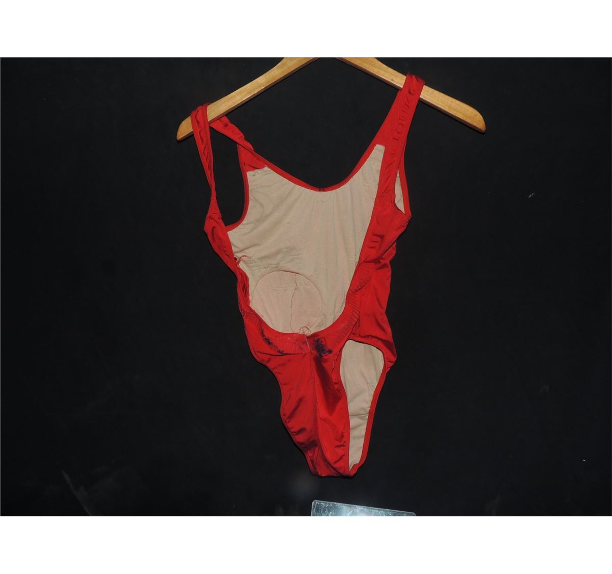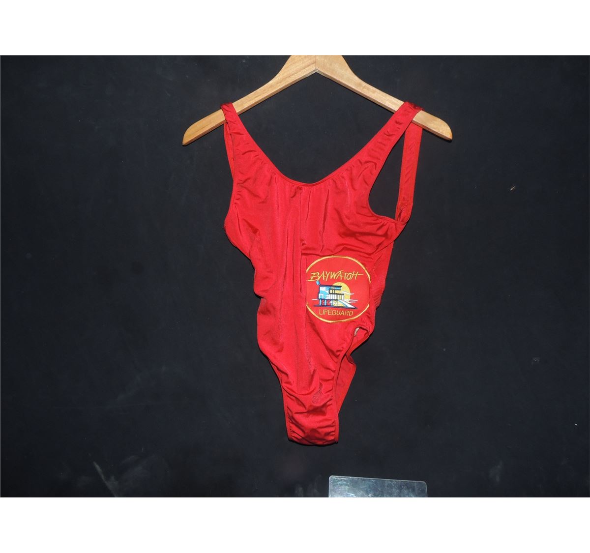 This is one of Carmen Electra's bathing suits Screen Worn in BAYWATCH! This particular suit can be Screen Matched because it was used in rescue scenes. The rear has velcro to secure the black strap linked to the rescue buoy. Still has black threads caught in the velcro from the strap.