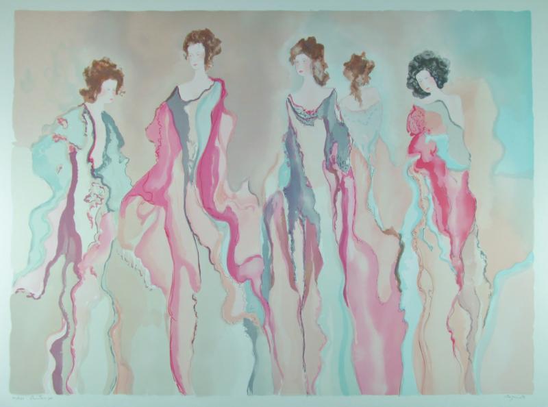 Jane Bazinet has emerged as an important American artist. Born in Basile, Louisiana, she began painting during the 60's. Bazinet produced her first graphics in the early 80's. Jane studied at Arizona State University for five years and continued studying art thereafter as an apprentice under the able tutelage of several painters. First exhibited in Scottsdale, Arizona, her paintings and prints soon found their ways into collections (both public and private) and galleries across the world. Although she has worked in numerous mediums, deftly treating a variety of themes, she is best known for her lyrical figurative work, which dwells at a mysterious crossroad between poetic realism and abstract expressionism. Her airy and whimsical women are adorned with flowing gowns in plush and tropical settings give off a feeling of relaxation and romance. She has been recognized as an artist with an extremely personal style and technique, which is romantic and contemporary. Her work is held in many public and private collections throughout the world and she has had many gallery shows throughout the United States and abroad. Her style and technique is contemporary as well as romantic and her works are very collectible.