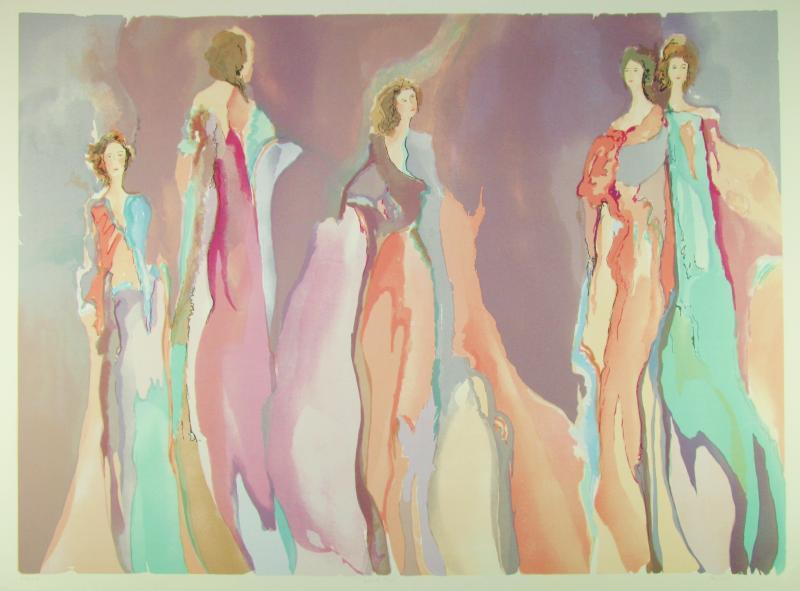 Jane Bazinet has emerged as an important American artist. Born in Basile, Louisiana, she began painting during the 60's. Bazinet produced her first graphics in the early 80's. Jane studied at Arizona State University for five years and continued studying art thereafter as an apprentice under the able tutelage of several painters. First exhibited in Scottsdale, Arizona, her paintings and prints soon found their ways into collections (both public and private) and galleries across the world. Although she has worked in numerous mediums, deftly treating a variety of themes, she is best known for her lyrical figurative work, which dwells at a mysterious crossroad between poetic realism and abstract expressionism. Her airy and whimsical women are adorned with flowing gowns in plush and tropical settings give off a feeling of relaxation and romance. She has been recognized as an artist with an extremely personal style and technique, which is romantic and contemporary. Her work is held in many public and private collections throughout the world and she has had many gallery shows throughout the United States and abroad. Her style and technique is contemporary as well as romantic and her works are very collectible.