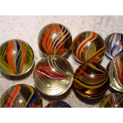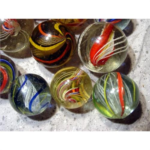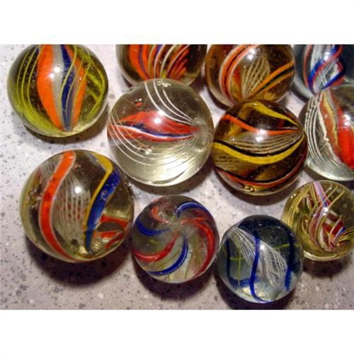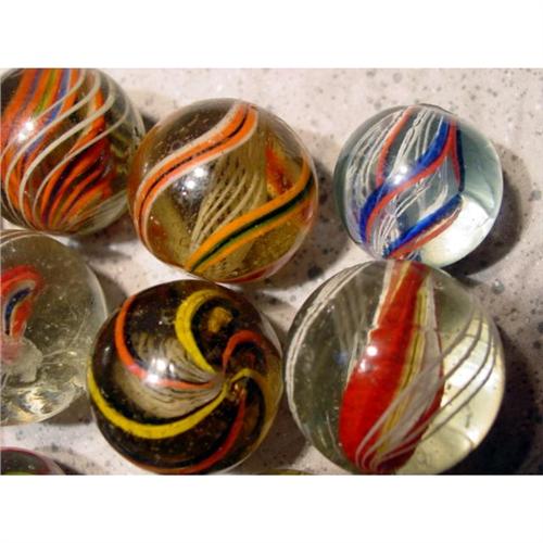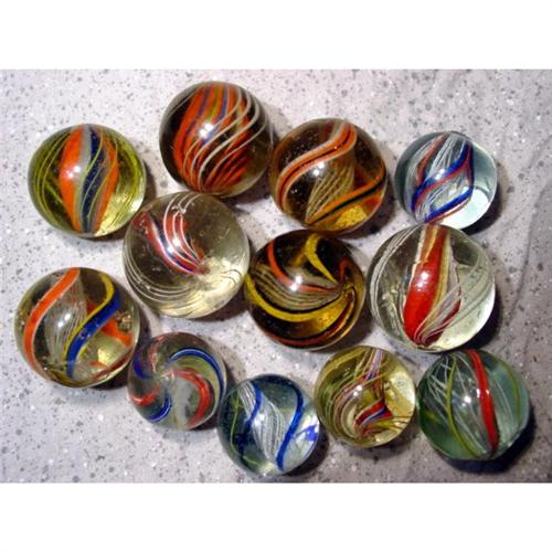 #98001 BB Marbles: 12 Assorted Large Swirls <b>SWIRL, Assorted core.</b> Lot of twelve marbles. Six are latticinio core, five are divided core, one is solid core. Nice variety of colors. All have damage. 1-3/16" to 1-7/16". Near Mint to Good(-).