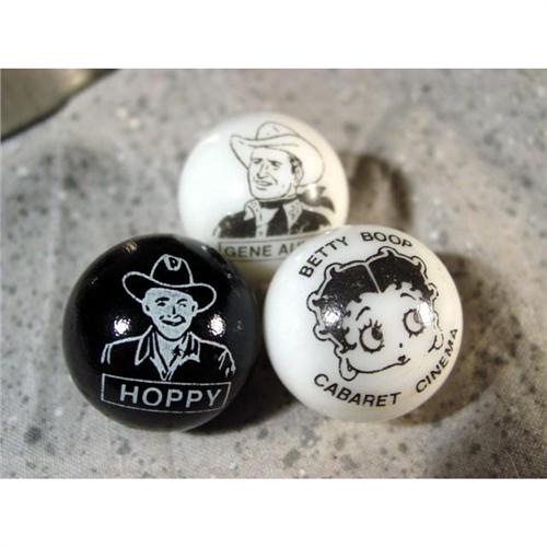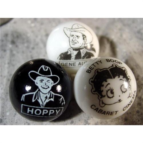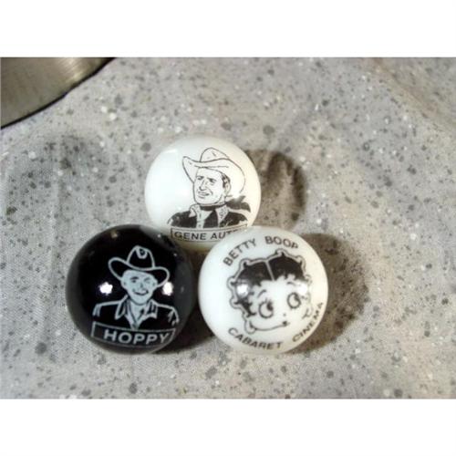 <b>OTHER MACHINE MADE, Character.</b> Lot of three marbles. All are silkscreen printed character marbles. One each of Hoppy, Gene Autry, Betty Boop. About 7/8". Mint. Note: Originally sold in CyberAuction #149, October 1, 1998.