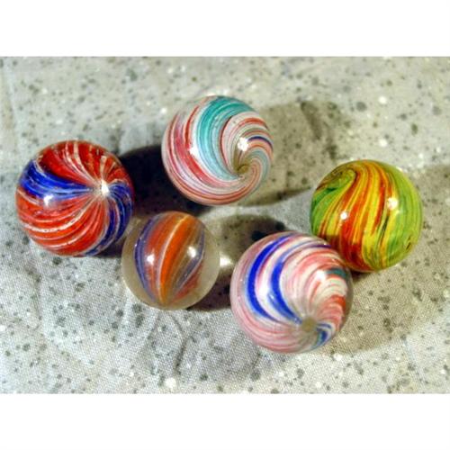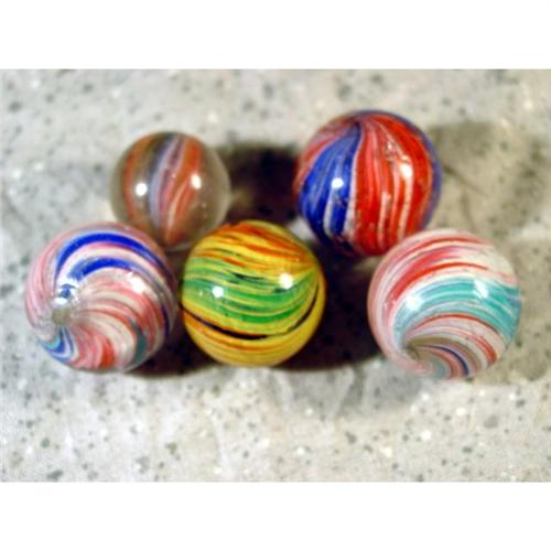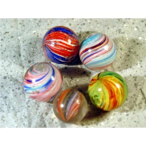 #98106 BB Marbles: 5 Assorted Onionskins <b>END OF DAY, Onionskin.</b> Lot of five marbles. Assortment of onionskins including a four-panel and a shrunken ribbon. All have small flakes. 11/16" to 13/16". Near Mint(+) to Near Mint(-).