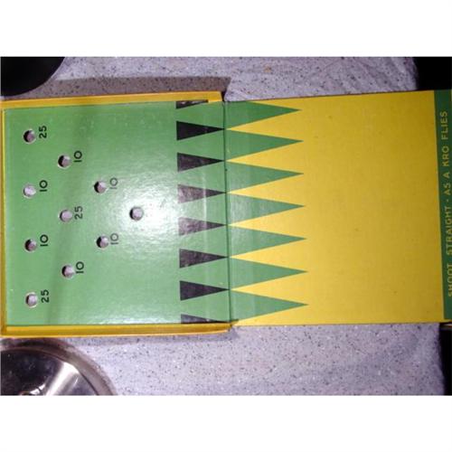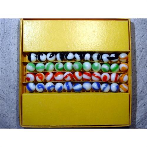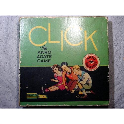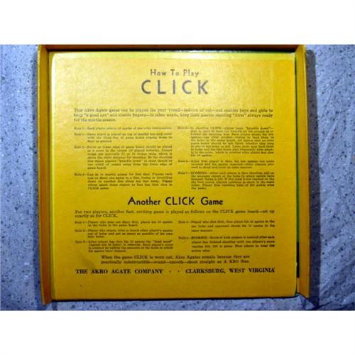 #1100 BB Marbles: Akro Agate Click Game complete<BR><BR><b>AKRO AGATE COMPANY, Original package.</b> Rare Akro Agate Company Click Game. A ramp type game. The box top shows three kids playing. It reads "Click / The Akro Agate Game. Two lower corners are split on the top. Some edge rubbing. If you take the top off, it reveals a tray with forty-five two-color white-base corkscrews. There are ten each of black/white, green/white, red/white, blue/white. Also four orange/white. Each of the groups of ten look to be same run, they may be original to the box. I think the oranges were put in to stop the marbles from rattling. Marbles are about 21/32"-11/16" and are Mint. Remove the tray and the bottom of the box folds out for the playing surface, with instructions. Bottom in great shape. Really nice. Box is 7-1/2" square. One of the few games produced by Akro.