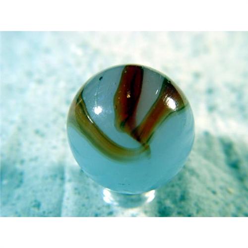 #1002 BB Marbles: Akro Experimental 1-3/16" 8.9<BR><BR><b>AKRO AGATE COMPANY, Experimental.</b> Very rare experimental Akro marble. Semi-opaque pale blue with three brown bands on one side. One tiny subsurface moon. This marble was acquired directly from Roger Hardy about 12-15 years ago. He had three types of these monster shooters. Two are this type with a patch. The other, offered in the previous lot, is the same base with no patch on it. Roger had less than a dozen of each type, if I remember correctly. I'm not sure where he got them, but he bought a lot from former employees of the factory. Clarksburg WV, circa 1925-1930. 1-3/16". Near Mint(+) (8.9).