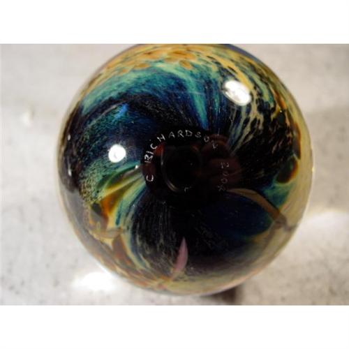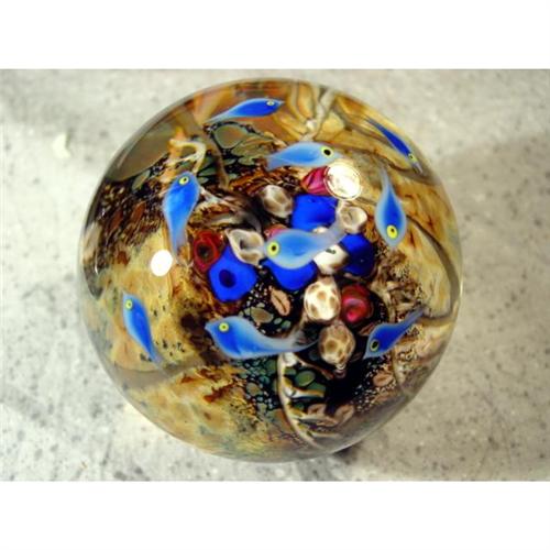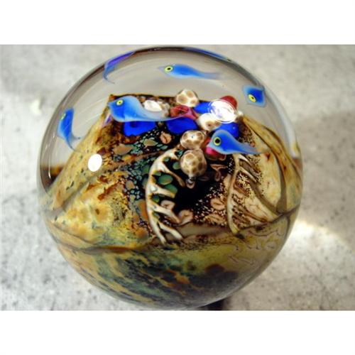 #1122 BB Marbles: Cathy Richardson Fish<BR><BR><b>CONTEMPORARY HANDMADE, Cathy Richardson.</b> "School of Fish". Large sphere. School of fish on the top swimming above sea floor. Very detailed. Signed "C Richardson 2004". 3-1/8". Mint (9.9).