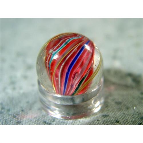 #98032 BB Marbles: Divided Core Swirl 5/8" 9.9 <b>SWIRL, Divided core.</b> Four band core. Two are pink and blue on white, two are pink and turquoise on white. Outer layer is four sets of yellow strands. Faceted pontil. Germany, circa 1870-1915. 5/8". Mint (9.9).