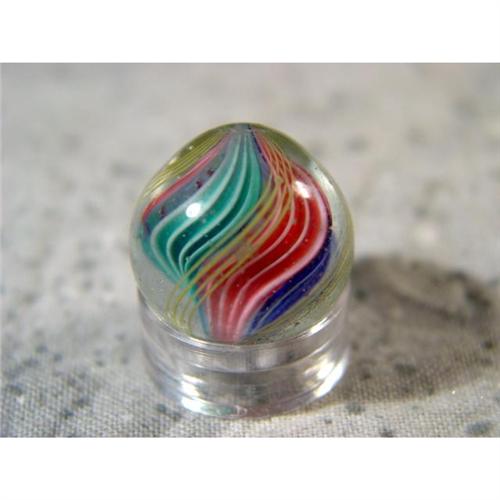 #98034 BB Marbles: Divided Core Swirl 5/8" 9.9 <b>SWIRL, Divided core.</b> Four band core. Two are pink on white, one blue on white, one turquoise on white. Outer layer is four sets of yellow strands. Both poles are faceted. Germany, circa 1870-1915. 5/8". Mint (9.9).