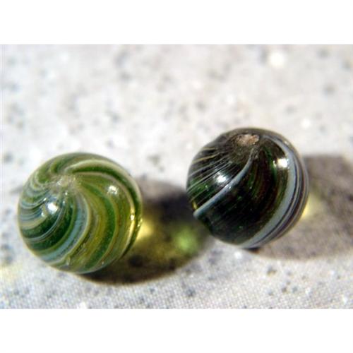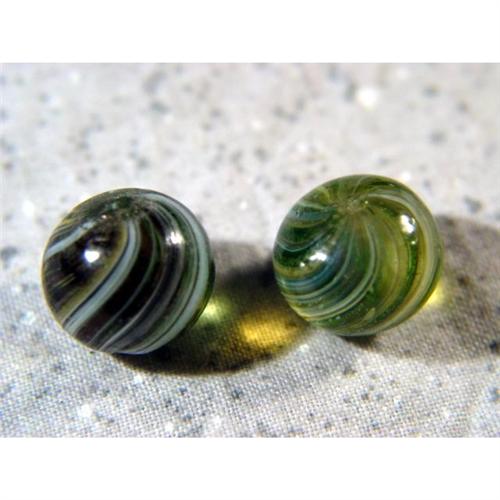 #98178 BB Marbles: Onionskin and Banded Swirl <b>ASSORTED HANDMADE.</b> Lot of two marbles. One is transparent green base, with subsurface layer of bands of very dark purple and surface of two bands of stretched white and yellow. «". Near Mint(+) (8.7). Other is a green and white onionskin, 17/32", Near Mint(+) (8.7).