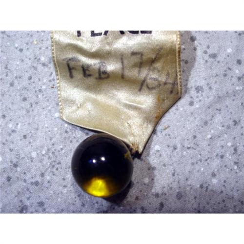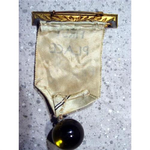 #1105 BB Marbles: Rare Marble Award Ribbon<BR><BR><b>MISCELLANEOUS, Award.</b> A very rare item. This is a first place ribbon that uses a marble as a weight to hold the ribbon down. Brass pinback bar at the top. Ribbon that is printed "First Place" is sewn to the bar. Handwritten on the ribbon is "FEB 17/34". A brown clearie with a small metal loop in it is sewn to the bottom of the ribbon so that it hangs flat when worn. Very rare, the only one I've ever seen. Overall length is 3-1/4" inches. In great shape. Circa 1934.