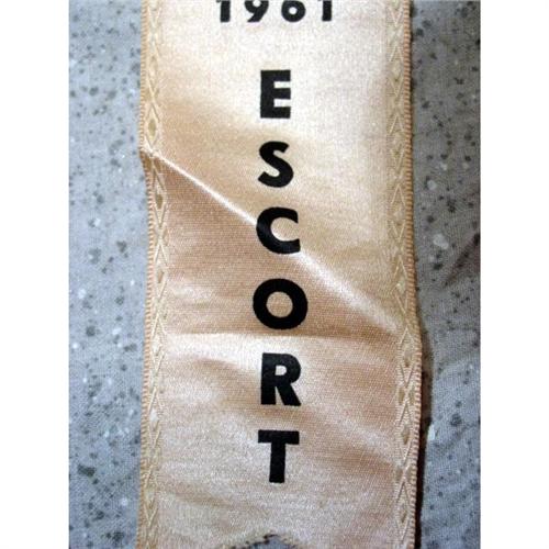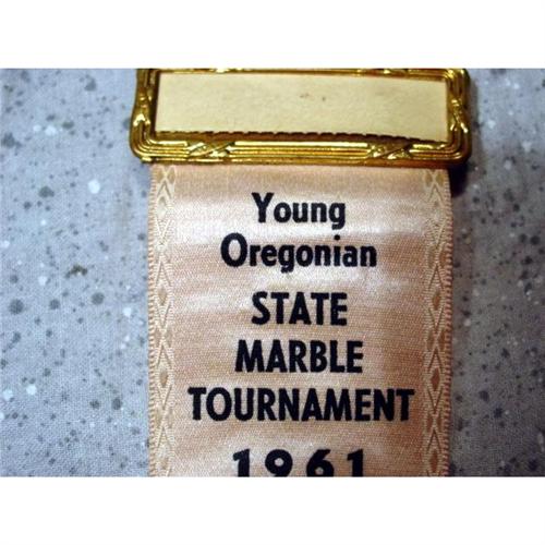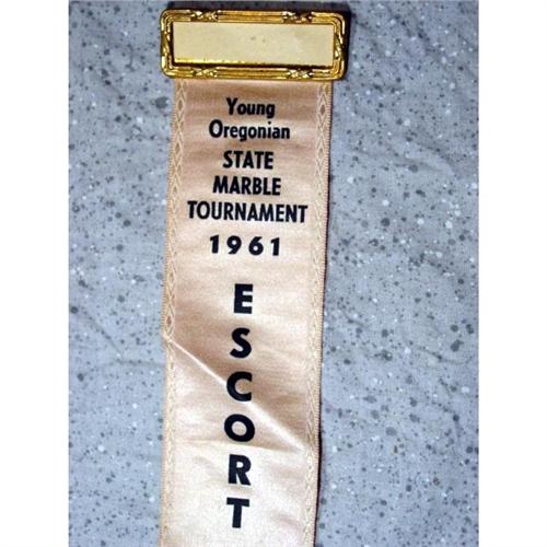 #98228 BB Marbles: Rare Marble Tournament Ribbon <b>MISCELLANEOUS, Tournament ribbon.</b> Very rare National Marbles Tournament ribbon for a chaperone. Pink silk ribbon. Printed in black is "Young Oregonian State Marble Tournament 1961 Escort". Attached to a pinback with a paper label that has not been used. The ribbon is in remarkable shape, given that it is over forty years old and the material and use. Rare item. 6" long, 1-1/2" wide. Mint (9.8).