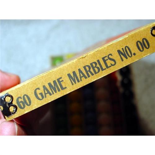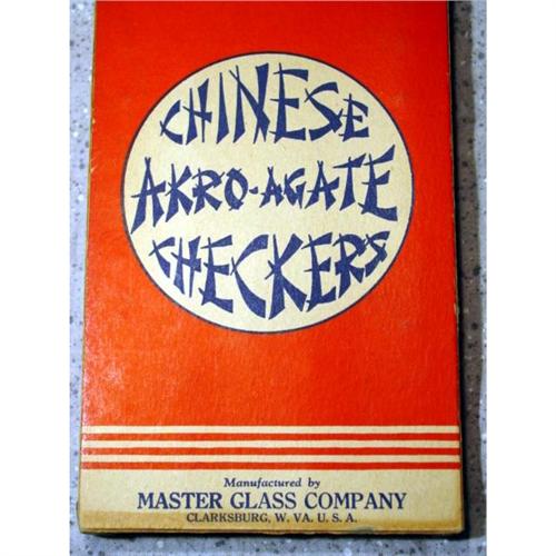 #98226 BB Marbles: Rare Master Glass Akro Agate Box <b>MASTER MARBLE/GLASS COMPANY, Original box.</b> An extremely rare Akro Agate Chinese Checkers box that is marked as Manufactured by Master Glass Company. Box top is red and white with blue printing. The center is the typical "Chinese Akro-Agate Checkers" in oriental style script. Bottom is marked "Manufactured by MASTER GLASS COMPANY Clarksburg, W. VA. U.S.A.". Bottom is cardboard. Metal tabs at all corners of top and bottom, no damager. Includes ten marbles in each of six colors. All Mint. 6" x 3-3/4" x 1".