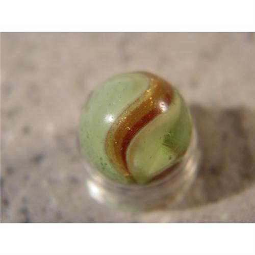 #98208 BB Marbles: Ribbon Lutz 9/16" 8.3 <b>LUTZ, Ribbon.</b> Ribbon core lutz. Transparent very light green base. White ribbon. Edged by two white-edged lutz bands. Small chip, some pits. Germany, circa 1870-1915. 9/16". Near Mint (8.3).