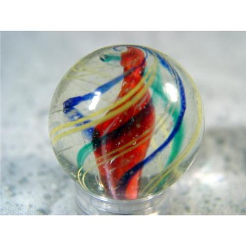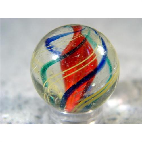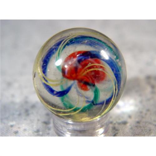 #98004 BB Marbles: Ribbon Swirl 15/16" 9.0 <b>SWIRL, Ribbon core.</b> Single ribbon core swirl. Three-layer marble. Core is opaque white enrobed in transparent pink. Middle layer is four bands of transparent blue. Outer layer is four pairs of yellow strands. Faceted pontil. Melt spot, several melt pits. Germany, circa 1870-1915. 15/16". Mint(-) (9.0).