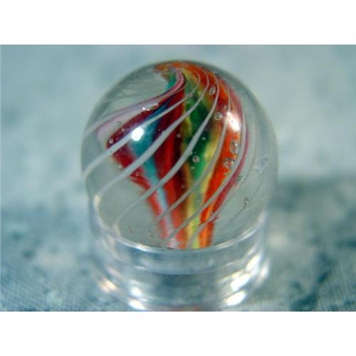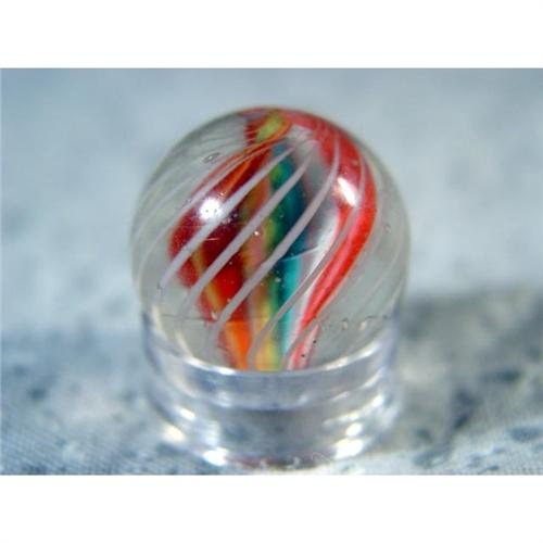 #98015 BB Marbles: Ribbon Swirl 21/32" 9.9 <b>SWIRL, Ribbon core.</b> Single ribbon core swirl. Pink, green and yellow, on white, on both sides. Outer layer is a cage of white strands. Faceted pontil. Germany, circa 1870-1915. 21/32". Mint (9.9).