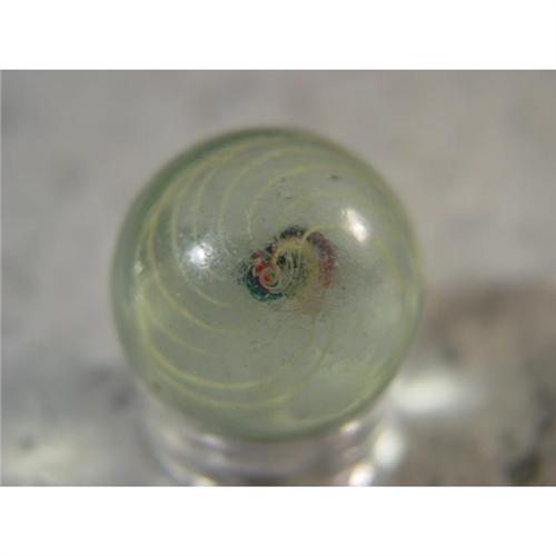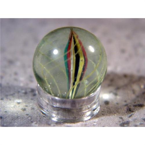 #98014 BB Marbles: Ribbon Swirl 23/32" 8.8 <b>SWIRL, Ribbon core.</b> Thin single ribbon core. Pink and green on yellow on one side. Pink and blue on white on the other. Outer layer is a cage of yellow strands. Several pits. Germany, circa 1870-1915. 23/32". Near Mint(+) (8.8).