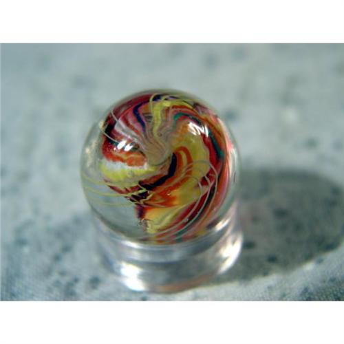 #98038 BB Marbles: Solid Core Swirl 21/32" 9.5 <b>SWIRL, Solid core.</b> White and yellow core with pink, blue and green on it. Outer layer is two sets of white strands, two sets of yellow strands. One melt spot. Germany, circa 1870-1915. 21/32". Mint (9.5).