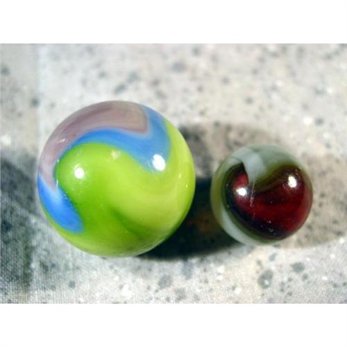 #1084 BB Marbles: Vitro Parrot & Conqueror<BR><BR><b>VITRO AGATE COMPANY, Parrot.</b> Lot of two marbles. First is a Parrot. The green is not aventurine. One pit. 7/8". Near Mint(+) (8.9). Other is a Conqueror. 5/8". Mint (9.9).