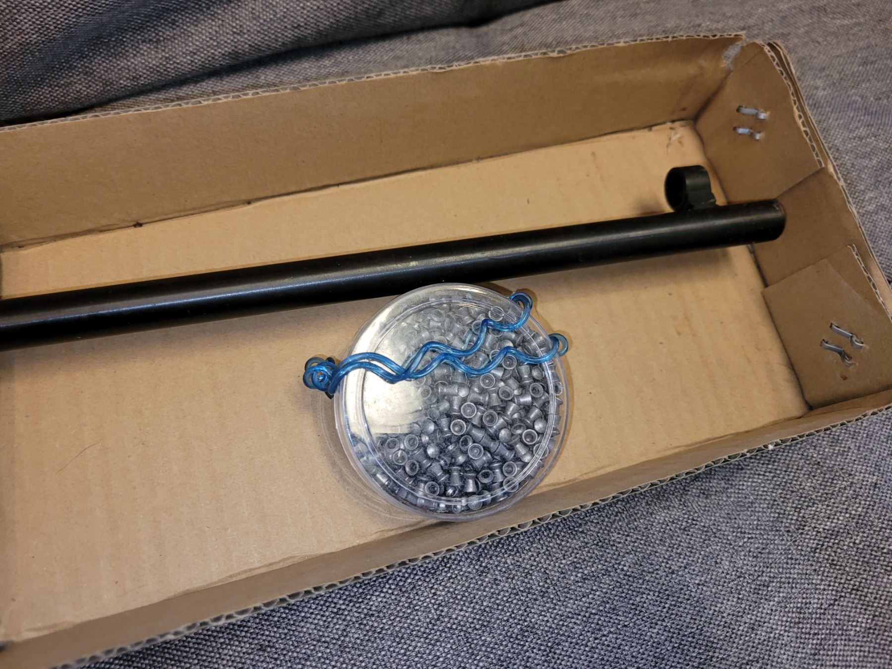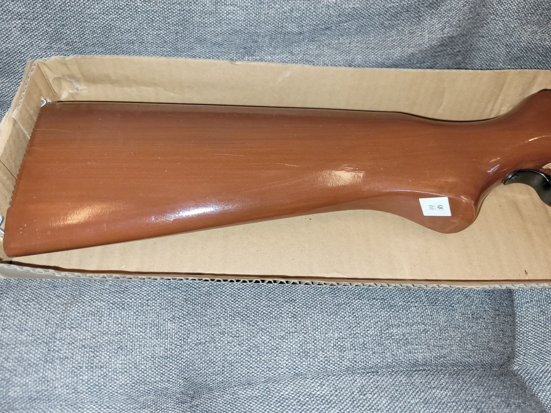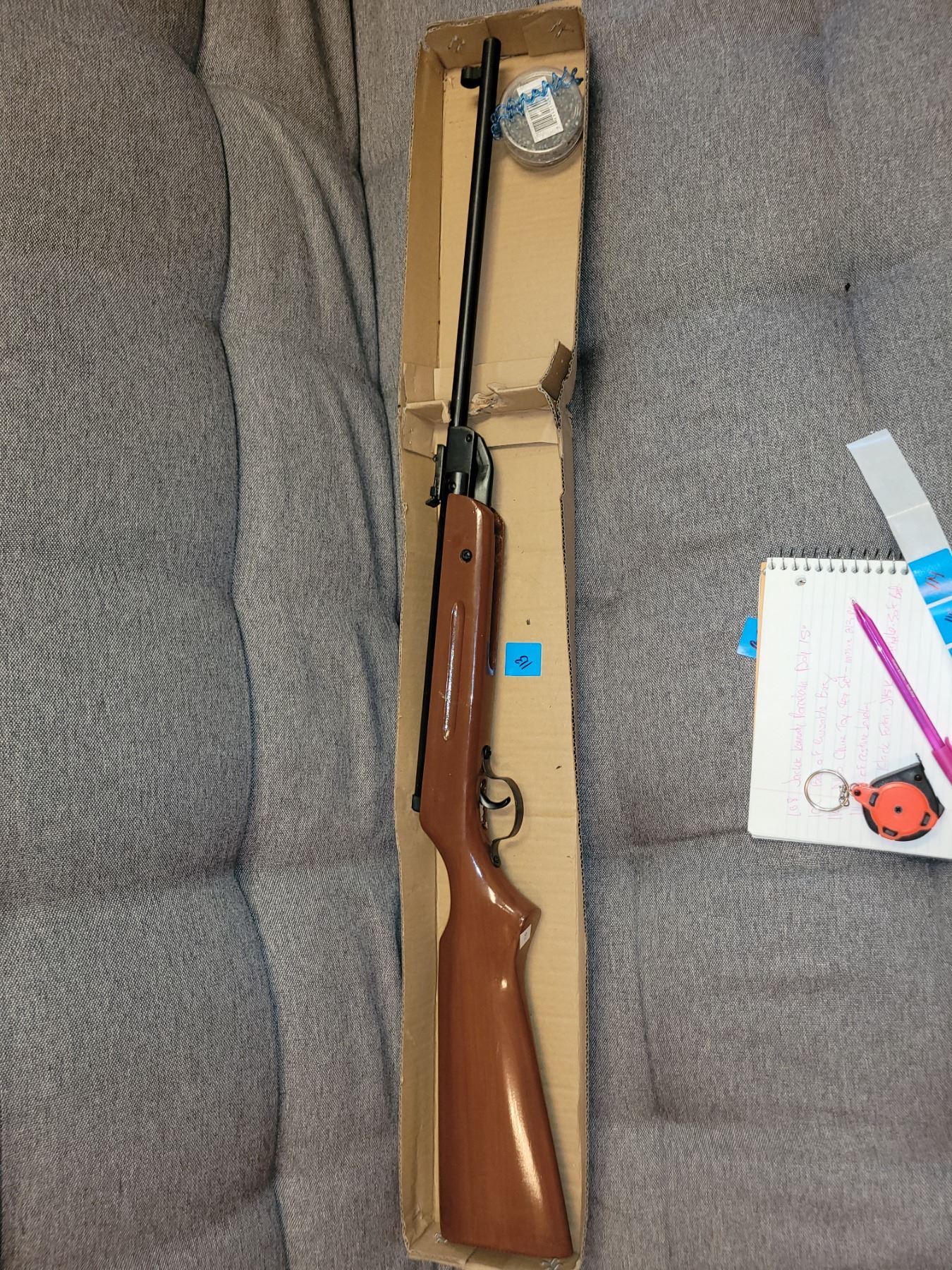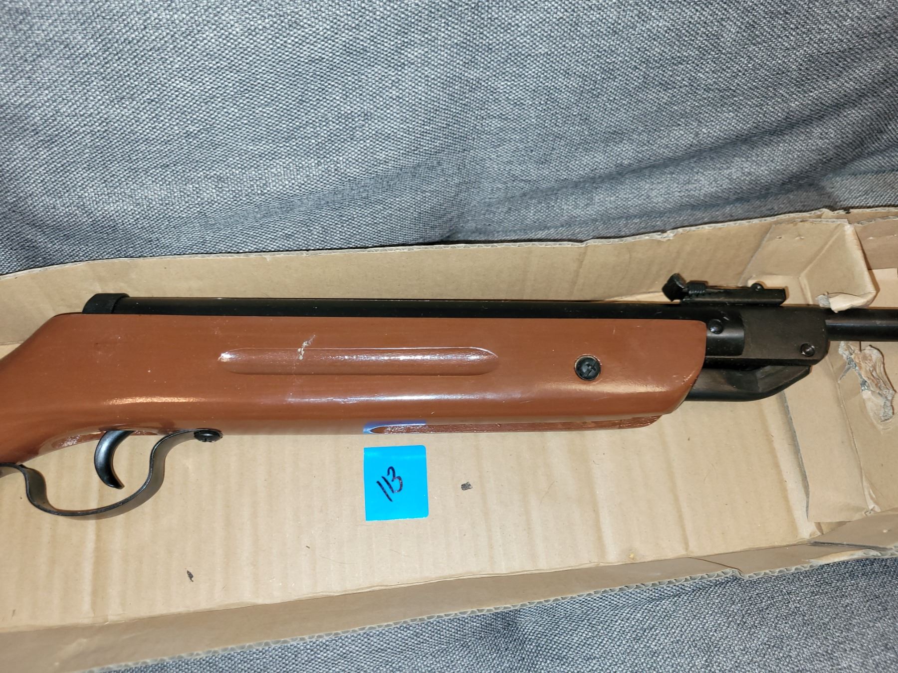 BB RIFLE GUN WITH PELLETS IN BOX. NO KNOWN MODEL OR SIZE. AS IS WHERE IS. NO REFUND. NO RETURNS