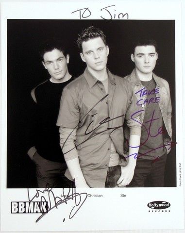 BBMAK Rock Group Signed Photo A signed PR photo of all three members of the English pop hit making sensation of the lat 1990's and early 2000's, BBMak. Includes personalized signatures of all three members: Christian Burns, Mark Barry and Stephen McNally. (B&W 8"x10").