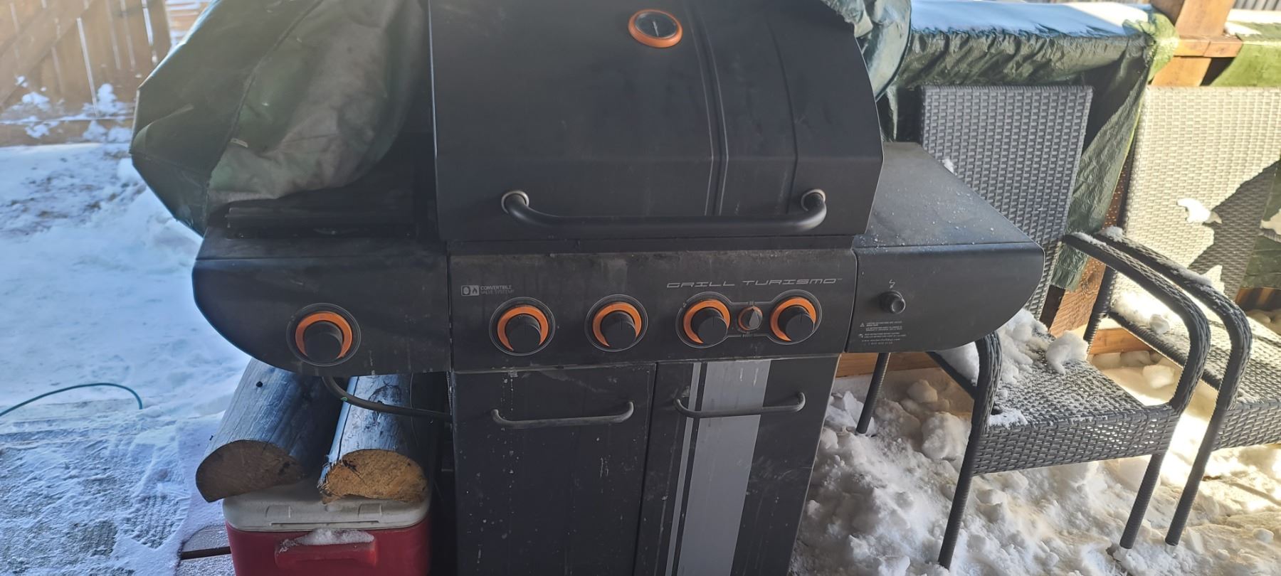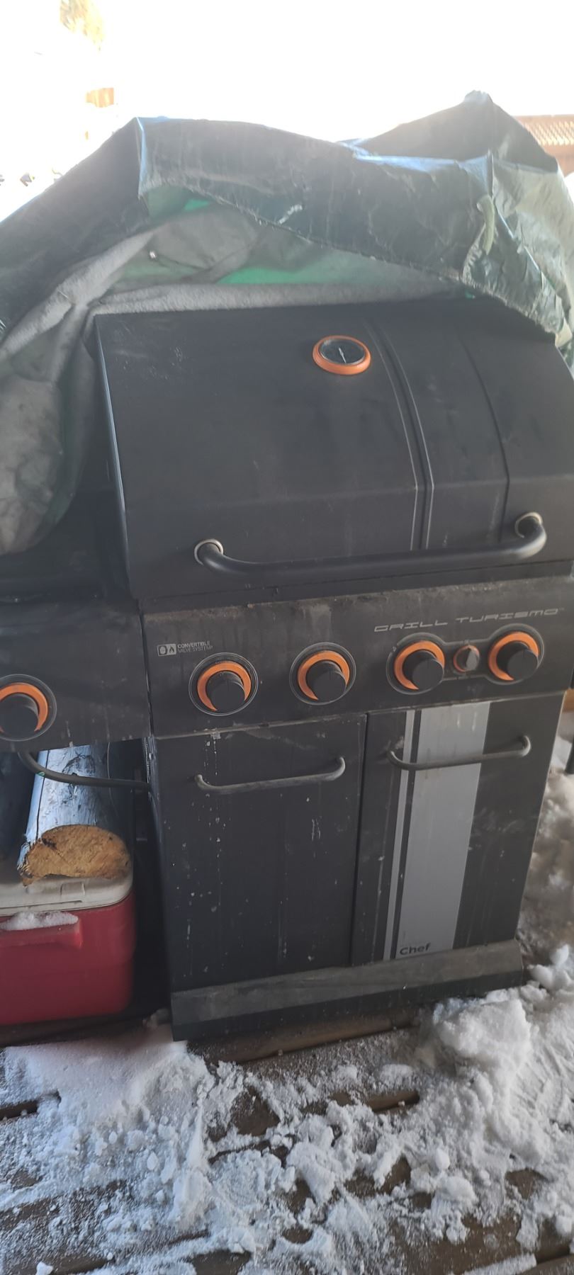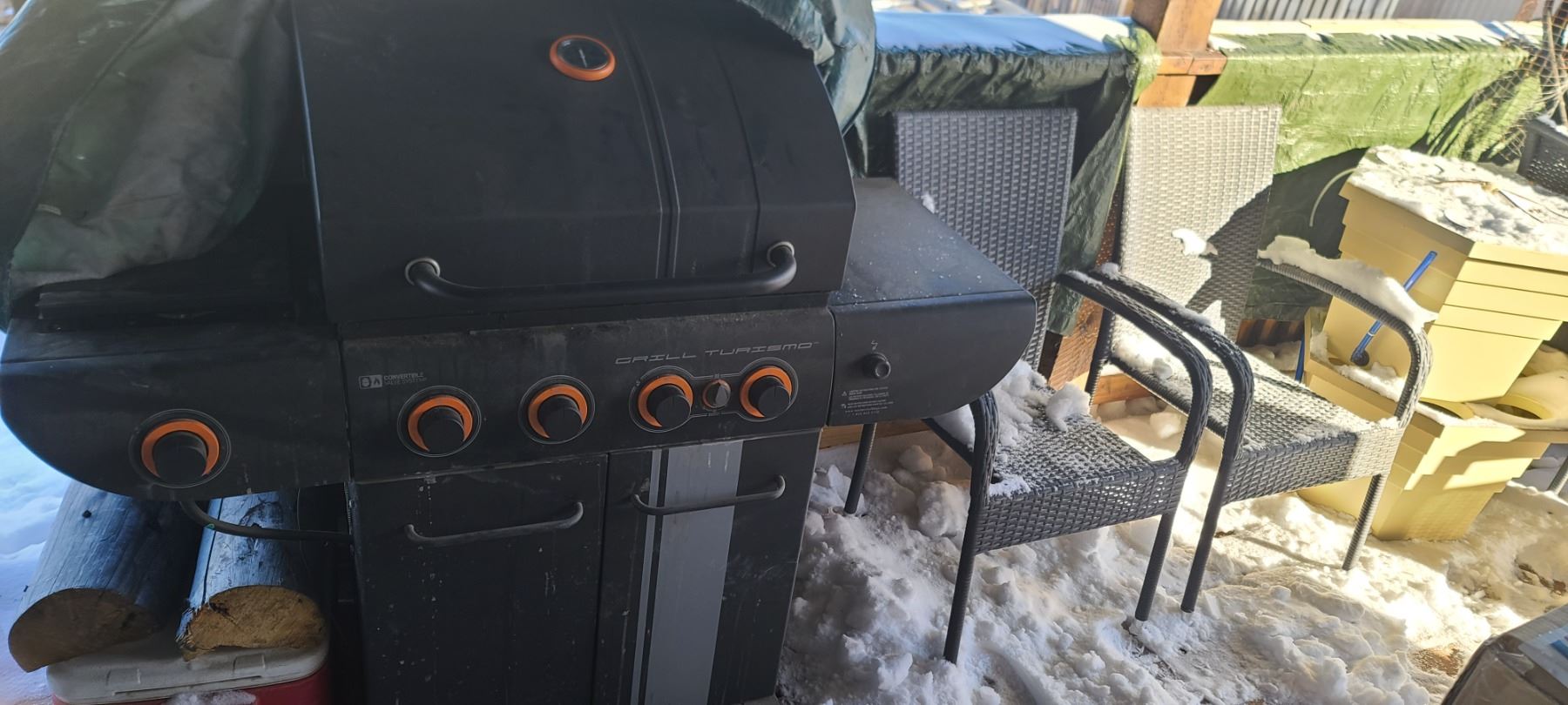 BBQ, PLANTERS, SAT DISH AND PATIO TABLE C/W 4 CHAIRS