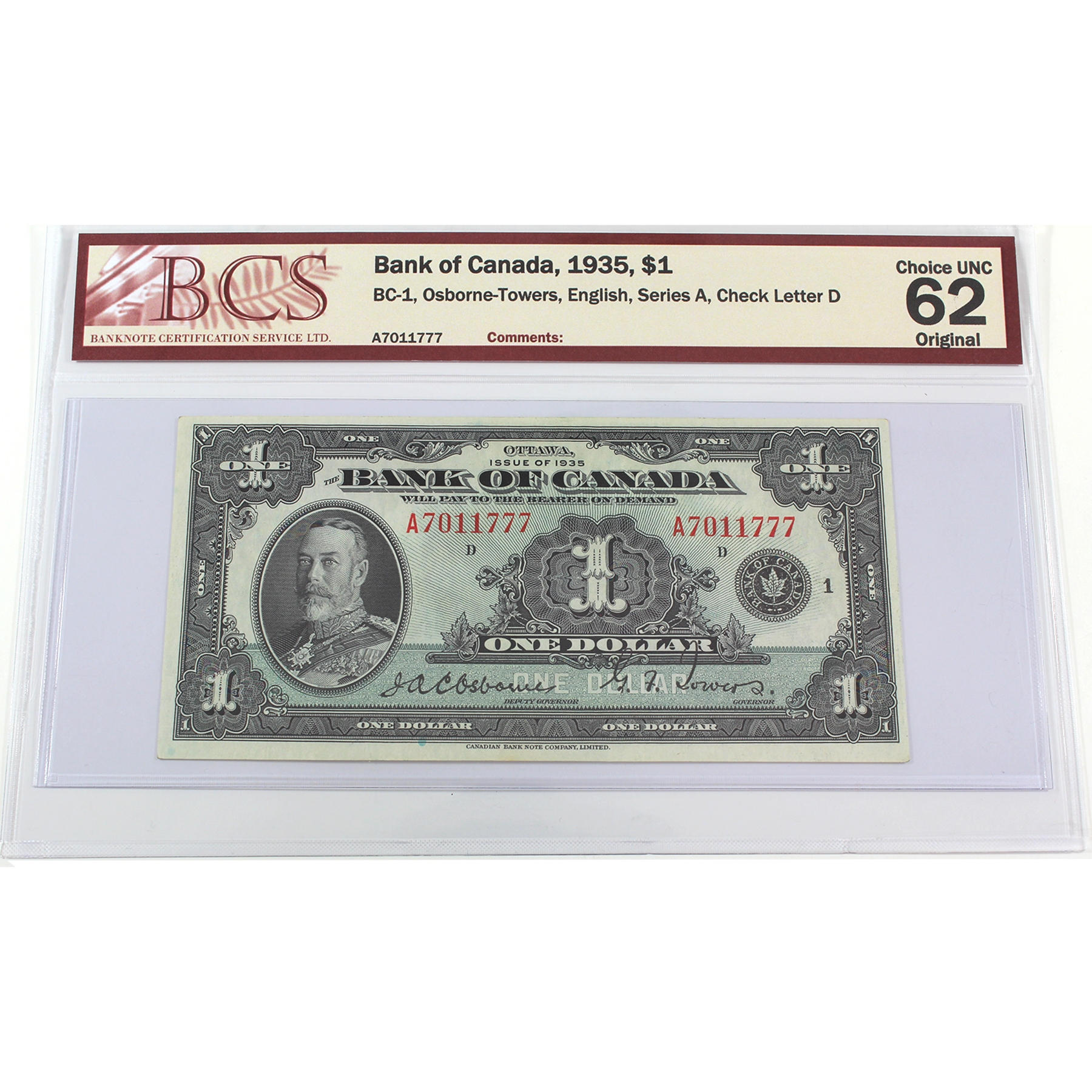 BC-1 1935 $1 English BCS CUNC62 Original Osborne-Towers SN: A7011777 Check Letter D