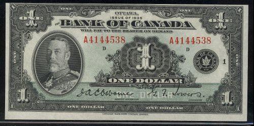 BC-1 1935 $1 Letter "A4144538 English text Original choice uncirculated, a little closely cut at top.