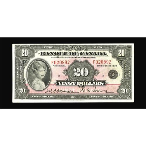 <B>BC-10 $20 1935</B></I><BR>A high grade French Text $20 which has retained its bright colors despite a modicum of circulation. <B>Very Fine-Extremely Fine.</B></I><BR><I>From The Halton Lake Collection</B></I>
