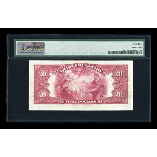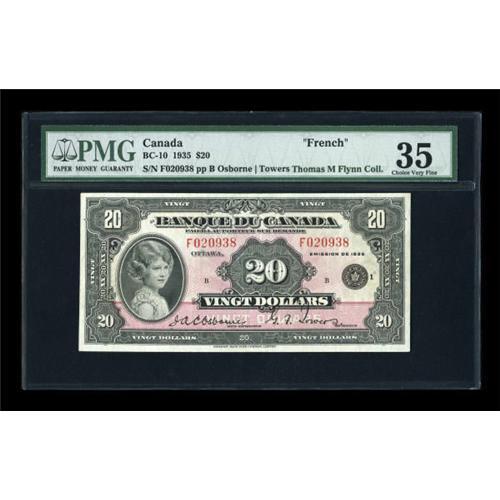 <B>BC-10 $20 1935</B></I><BR> A nice evenly circulated example of the very scarce French Text $20. PMG has graded this note <B>Choice Very Fine 35.</B></I><BR><I>From The Thomas M. Flynn Collection</B></I><BR><BR><b>Shipping:</b> Coins & Currency (<a target="_blank" href="http://www.heritageauctions.com/common/shipping.php">view shipping information</a>)
