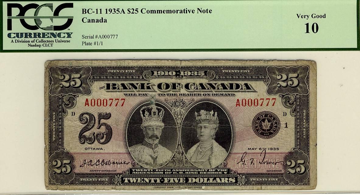 BC-11, 1935 $25 #A000777. A nice PMG VG-10 note with particular serial number