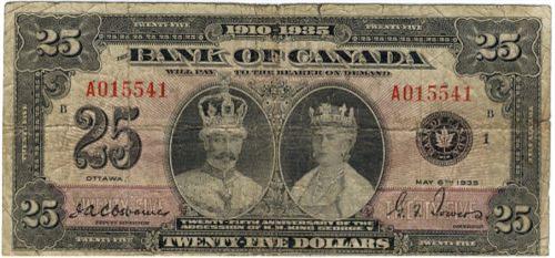 BC-11 1935 $25 English text A015541. A solid VG+ note with a few minor edge nicks. An affordable example.