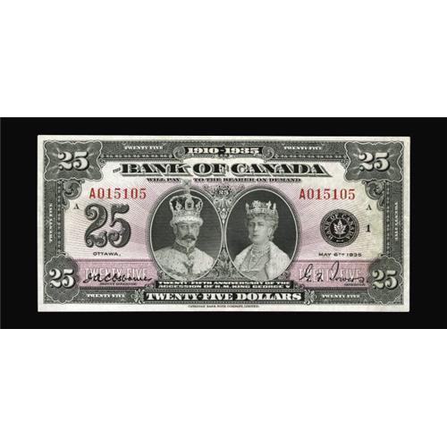 <B>BC-11 $25 1935</B></I><BR>A second unusually high grade English Text $25 from the Halton Lake holdings. This well margined specimen appears new until examined with great care. <B>About Uncirculated.</B></I><BR><I>From The Halton Lake Collection</B></I>