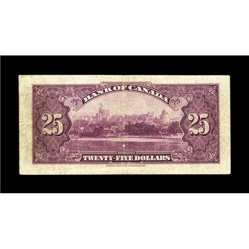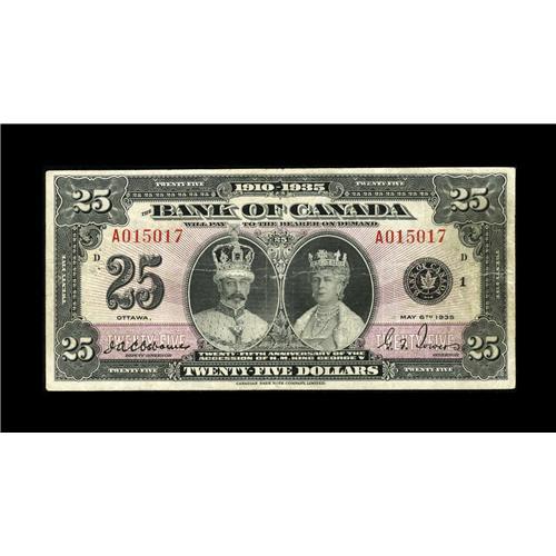 <B>BC-11 $25 1935</B></I><BR>This denomination was not part of the regular Series of 1935 issue, but was printed as a special commemorative tribute marking the twenty-fifth anniversary of H.M. King George's accession to the throne. The new Charlton catalogue states that of the 140,000 pieces printed using the English text and 20,000 pieces bearing the French text a combined total of only 1840 specimens were outstanding by 2006. This English Text example is well centered and has bright colors for the grade. <B>Fine.</B></I><BR><BR><b>Shipping:</b> Coin/Currency (<a target="_blank" href="http://www.heritageauctions.com/common/shipping.php">view shipping information</a>)