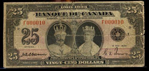 BC-12 1935 $25 French text F000010 G-VG. One of the LOWEST number recorded. Extremely rare and popular! According to Charlton, notes with such a low serial number command a substantial premium especially in the FRENCH series.