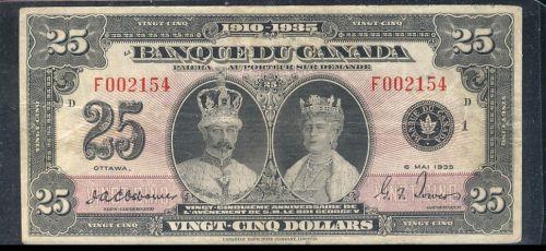BC-12 1935 $25 French text F002154 about VF. A very nice and problem free example. Scarce!