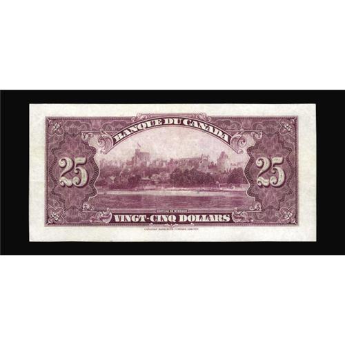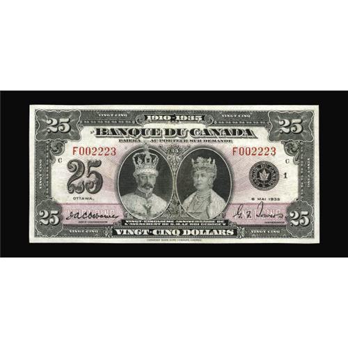 <B>BC-12 $25 1935</B></I><BR>This denomination was not part of the regular Series of 1935 issue, but was printed as a special commemorative tribute marking the twenty-fifth anniversary of H.M. King George V's accession to the throne. While 140,000 English Text examples were printed, a mere 20,000 of their French Text compatriots were issued. The entire issue was in circulation for only two years, as the Bank of Canada in May of 1937 chose to cancel all new $25 notes and redeem all those in circulation. Of the 160,000 pieces issued in both languages, a total of only 1840 were outstanding by 2006. <B>Very Fine+,</B></I> with sharp colors and good centering.<BR><I>From The Wellington Collection</B></I>