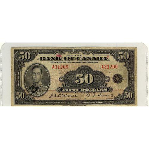 BC-13 1935 $50 English text. A very popular high denomination issue with technical grade of Fine. The note shows two small writing spots one on front and one on back. A couple of minor tears but not distracting. An affordable example