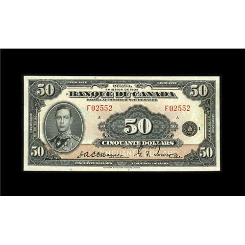 <B>BC-14 $50 1935 About Uncirculated.</B></I> The French text $50 is a rarity in all grades, and a major rarity in this state of preservation. Expect to see a realization here in the area of...