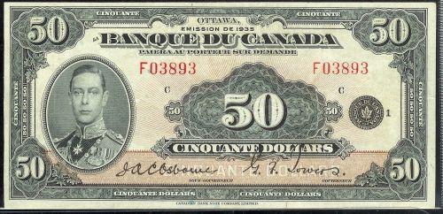 BC-14 $50 1935 "French text" F03893 about EF, fairly well centered and quite clean. A rare and attractive example.