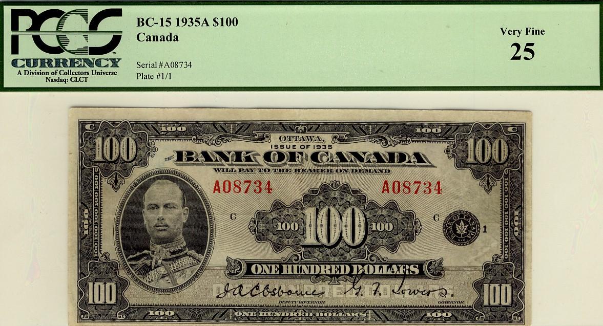 BC-15, 1935 $100 #A08734. A solid PMG VF-25 note with full colour.