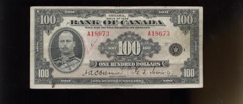 BC-15 1935 $100 A18673 English text VF+, clean and bright but with a crayon check mark on face.
