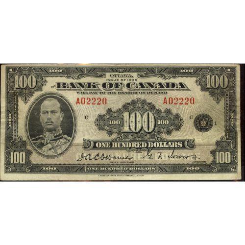 BC-15 1935 $100 English text Two digit "RADAR" A02220 F+. Radars are rarely seen on 1935 notes especially on high denominations. Rare and attractive.