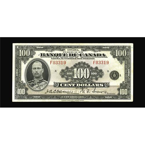 <B>BC-16 $100 1935</B></I><BR>A high end example of the very scarce 1935 French Text $100. There is a touch of very light staining in the left margin, but otherwise this specimen appears new until closely examined. <B>Extremely Fine+.</B></I><BR><I>From The Halton Lake Collection</B></I>