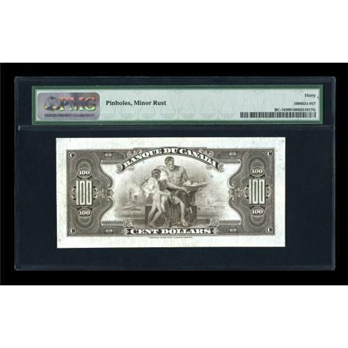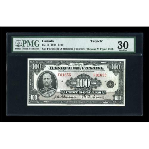 <B>BC-16 $100 1935</B></I><BR> This French Text $100 is one of the great Canadian small size rarities, with an original printing of only 17,500 pieces. The Flynn collection example is a bright and well centered piece which displays only the lightest evidence of real circulation. The PMG holder notes "Pinholes, Minor Rust." We seldom chide grading services, especially PMG, which does a careful and conservative job of evaluating notes it grades, but these comments represent incredible nit-picking, as the "pinholes" consist of perhaps three microscopic pinpricks that affect absolutely nothing and the "minor rust" is so minor we have no earthly idea what PMG thinks it saw, as the "rust" must have disappeared between the time the note was graded and the time this cataloguer described it...because it certainly isn't present now. PMG <B>Very Fine 30</B></I>.<BR><I>From The Thomas M. Flynn Collection</B></I><BR><BR><b>Shipping:</b> Coins & Currency (<a target="_blank" href="http://www.heritageauctions.com/common/shipping.php">view shipping information</a>)