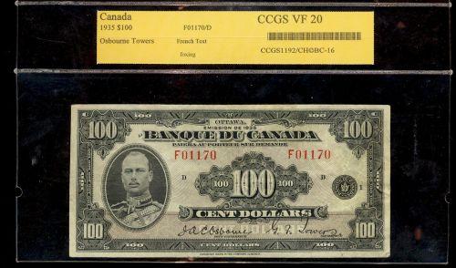 BC-16 1935 $100 French text F01170 "CCGS VF20. Very scarce note and difficult to find in any grade. A problem free example.