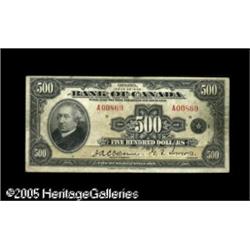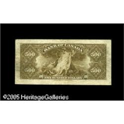 <B>BC-17 $500 1935</B></I><BR>Collectors possess only eight English language $500s, with the existence of a single French $500 being mere speculation and conjecture. This denomination was officially retired in July 1938, and it is a fact that a scant forty $500s remain outstanding as of 2002. Examination divulges an edge tear at top center that barely penetrates the frame line of this ultra Canadian rarity that will cast a majestic shadow over the next collection it enters. <B>Very Fine.</B></I> Lot:15523
