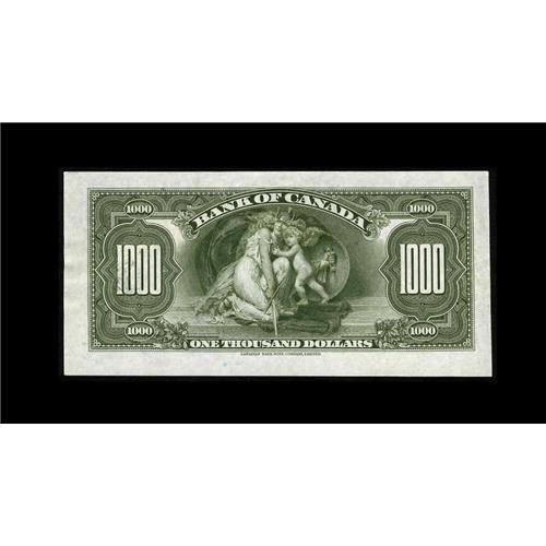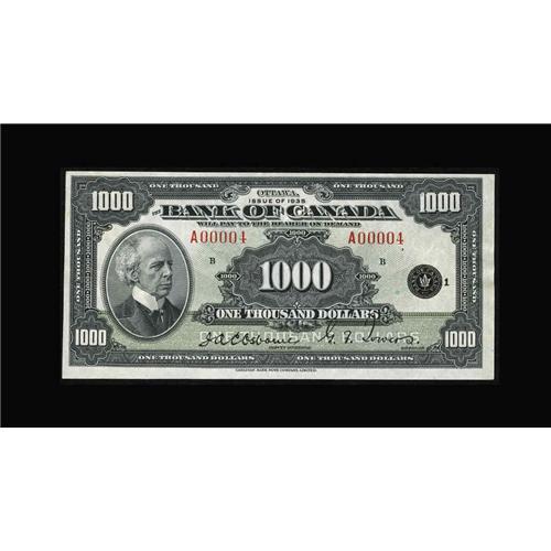 <B>BC-19 $1000 1935 Choice Crisp Uncirculated.</B></I> This scarce $1000 has an interesting pedigree, having once belonged to the Bank of Canada collection, from which it was stolen and returned. It has a fair amount of handling, although no evidence whatever of any circulation, and bears low serial number A00004 as an added enhancement to what is already a very pretty and significant Canadian rarity.
