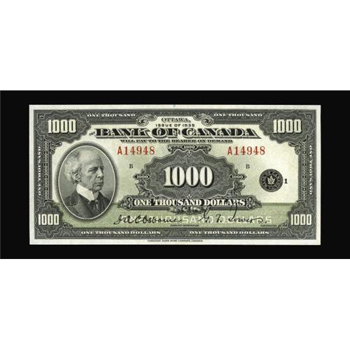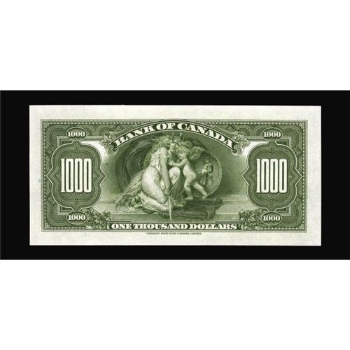 <B>BC-19 $1000 1935</B></I><BR>Unlike the lower denomination notes in the 1935 series, the unissued $1000 notes were not destroyed by the Bank of Canada, nor were they withdrawn from circulation after 1937. In fact, the 1935 thousands were released into circulation as late as 1952, and could be found in banks for many years thereafter. Truly high grade pieces, however, are scarce, with French Text examples in the higher grades decidedly rare. This English Text $1000 is fresh, well centered, and fully bright. <B>Crisp Uncirculated.</B></I><BR><I>From The Halton Lake Collection</B></I>